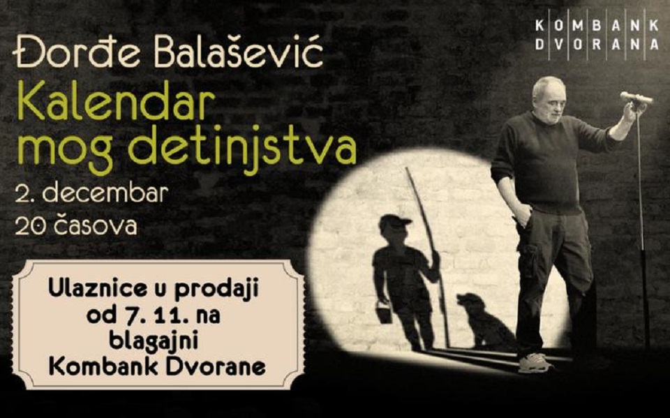 Još jedan velikan naše muzičke scene, mnogima poznat od najranijeg detinjstva, kantautor, pesnik i glumac Đorđe Balašević večeras drži drugi u seriji koncerata koji će se održavati u Kombank dvorani 02., 04., 06., 07. i 09. decembra. Koncert – ili možda bolje da kažemo scenski nastup – „Kalendar mog detinjstva“ u već dobro poznatom stilu „Đoleta“ Balaševića istovremeno je nastup stand-up komedije, koncert i svojevstan recital. Kroz pripovedanje o događajima koji su obeležili Balaševićevo detinjstvo i klavirsku pratnju Aleksandra Dujina, provlače se dobro nam poznati hitovi, stari i novi...