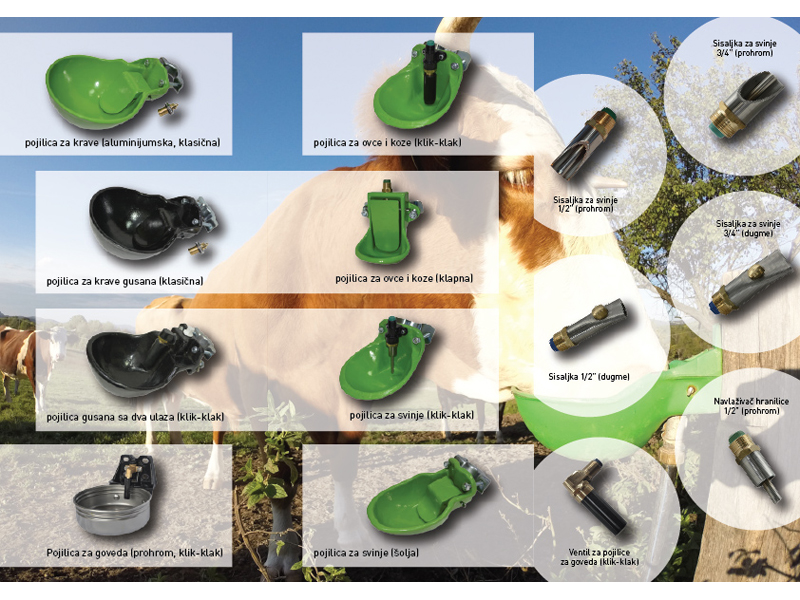 Our range includes aluminum and cast iron drinkers for cows and horses, drinkers for sheep and goats, pigs with flap and click-clack valves, suckers for pigs, valves, rubber parts, spare parts, pig catching tongs, sheep hooks, combs, reducers for tanks.
