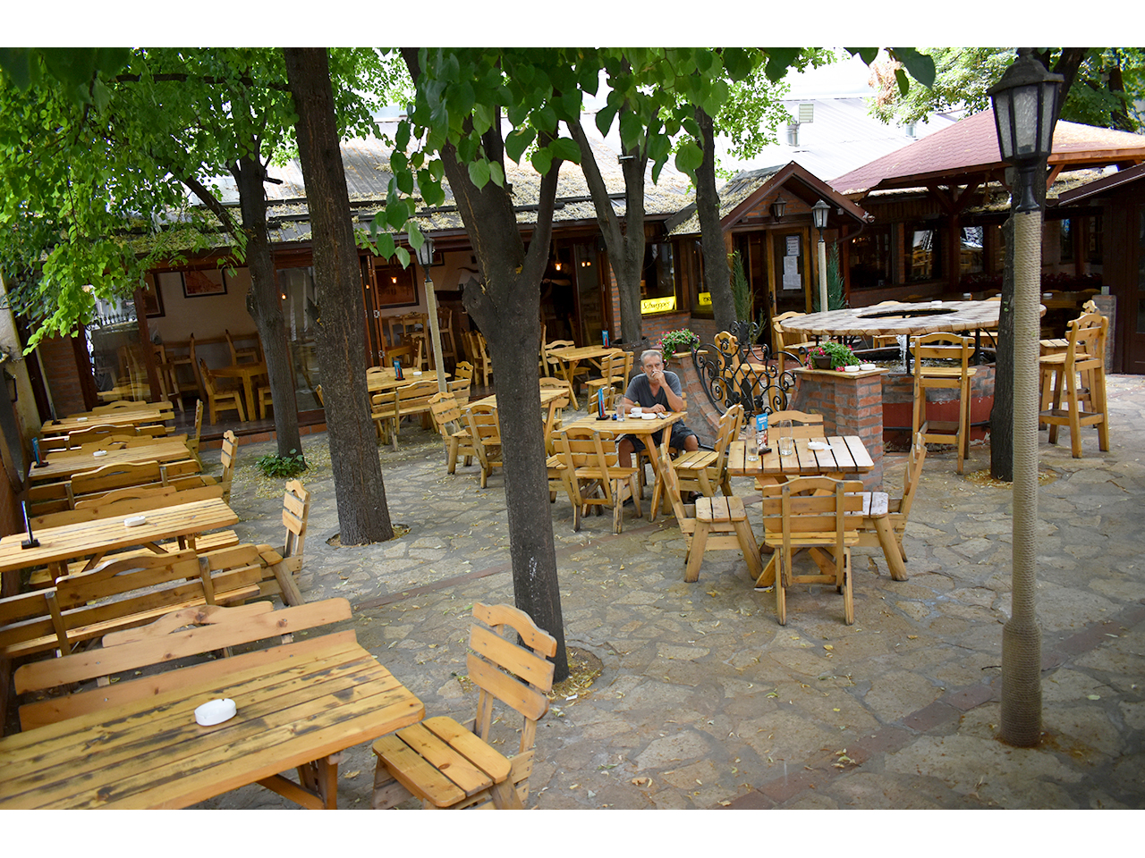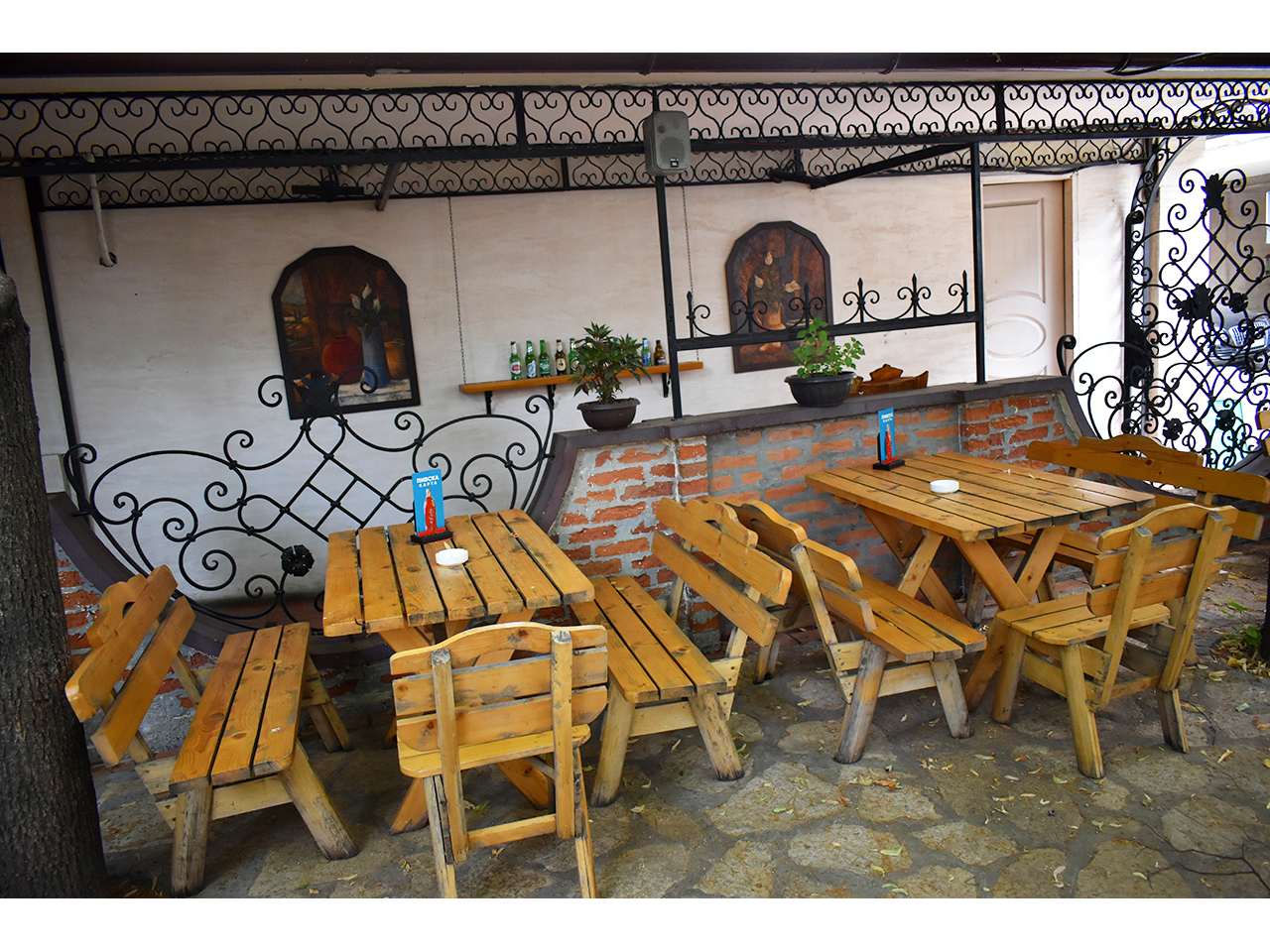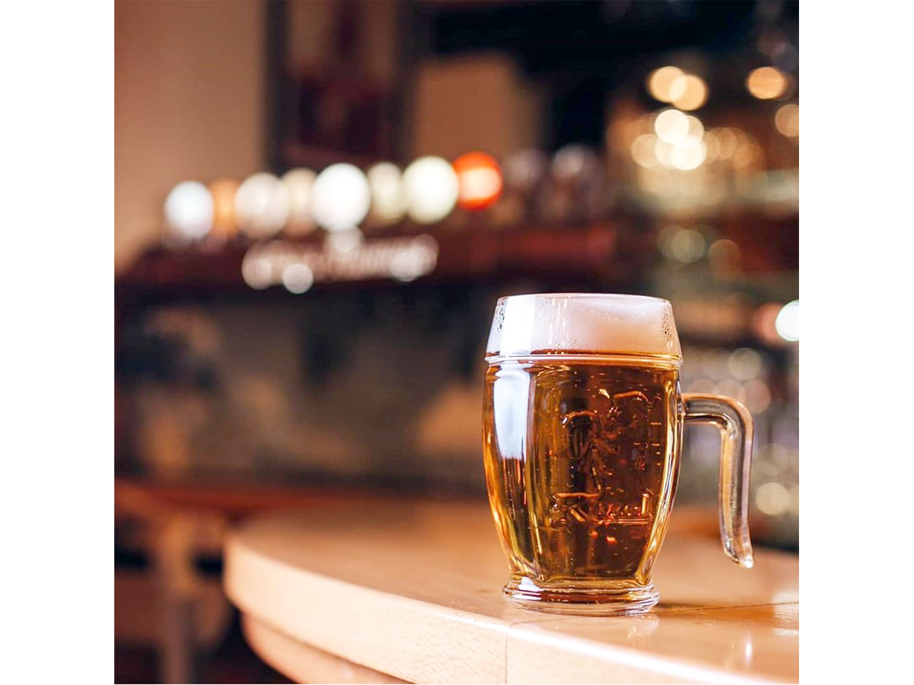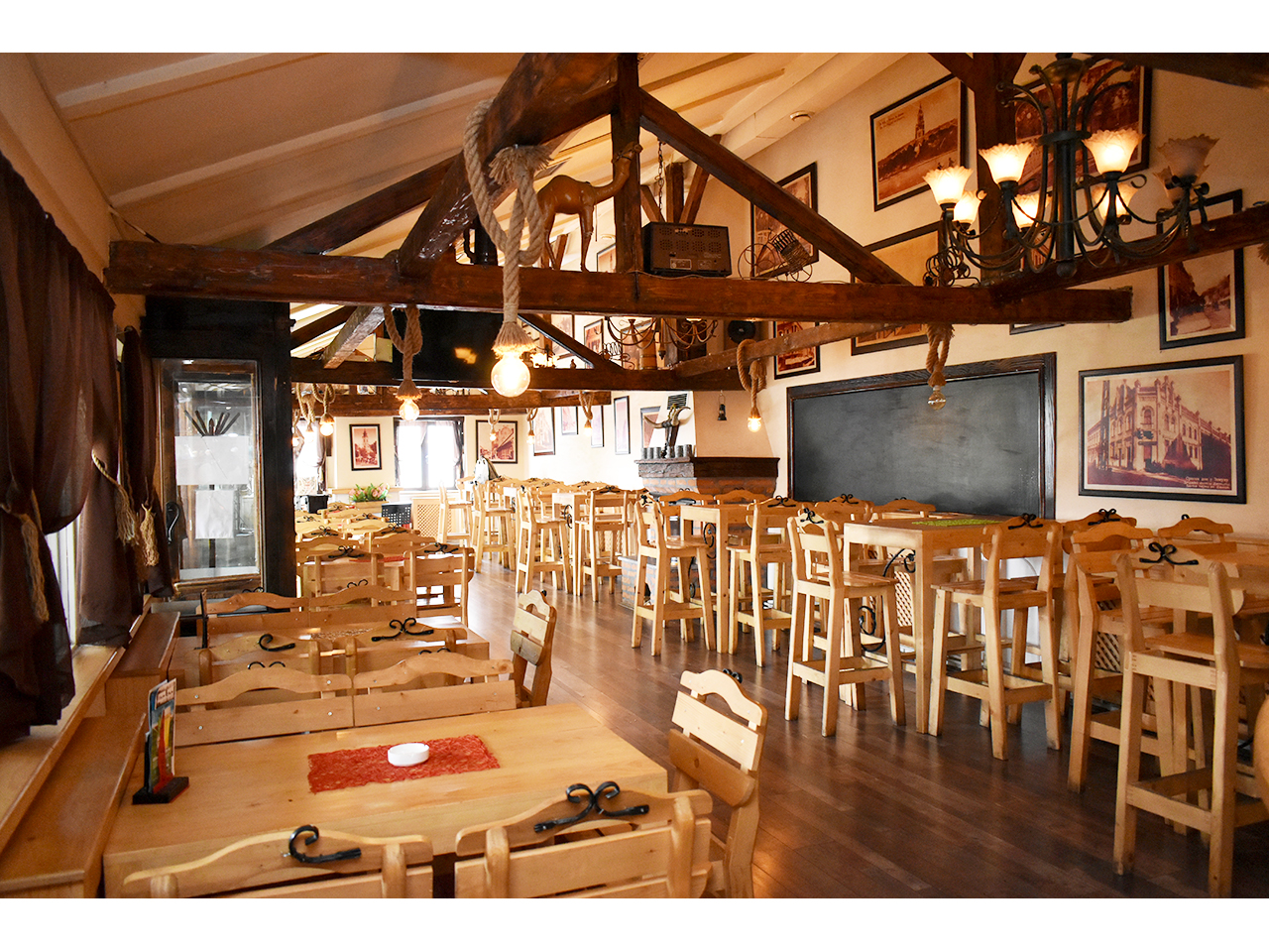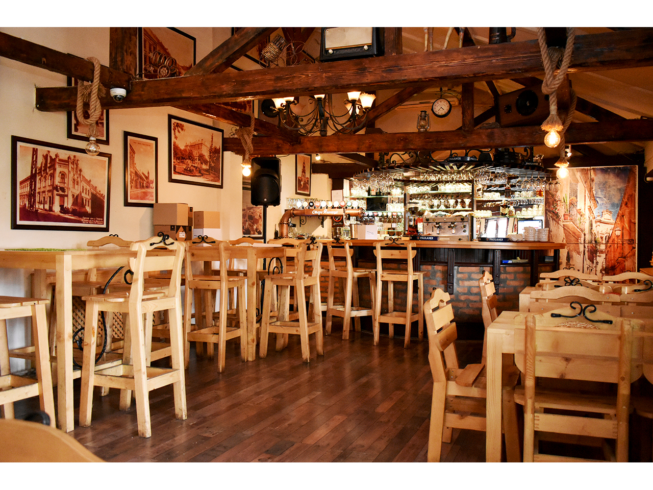 Giraffe Tavern 23 features an authentic tavern ambiance—wooden tables and benches, a long bar with taps, and chandeliers with large beer mugs. The selection of beer and food is rich and of very high quality.
