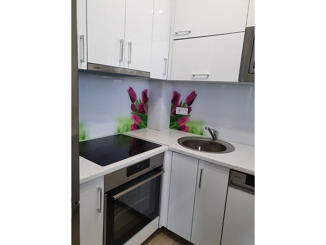 Installing glass between the lower and upper kitchen elements is a new trend, and in addition to being more practical to maintain, you can also choose the color of the glass according to the tone chart that would accompany the kitchen elements.Glass can be made with a print on foil so that we would have a unique version that would stand out and which, in agreement with you, could be a perfectly refreshing solution for your kitche...