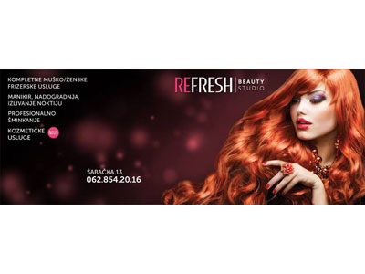 After much work, the experience we have gained in our industry we decided to do something new, and that is the beauty studio ** REFRESH **. Life has become extremely stressful, tense, fast, and do not have time to take time for yourself. The most important thing is what we feel, what we see, what we hear ... come to our corner and make sure that you get out of there completely recovered from their everyday problems you encounter.If you need a touch-up, beauty, you want to get away from the everyday studio * Refresh * is the place for you ...With us you can count on:- Male / female - hairdressing services carried out by top hairdressers- Cutting (creative hair design) for ladies, men and children- Wash and blow dry hair- Creative design locks strainer- Colouring grown-out hair- Putting the...
