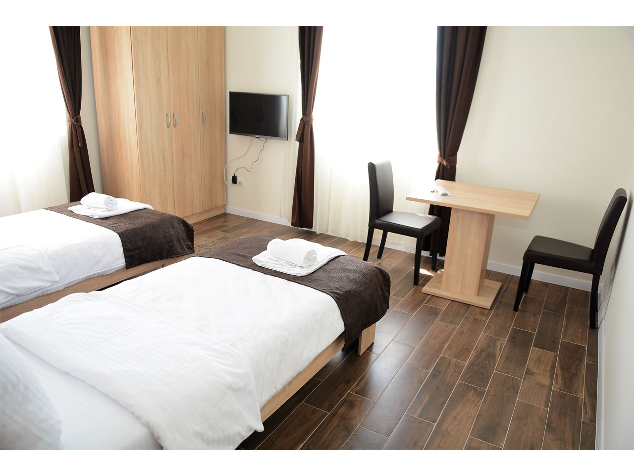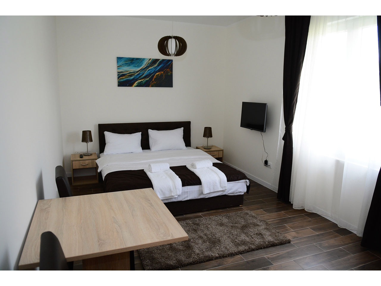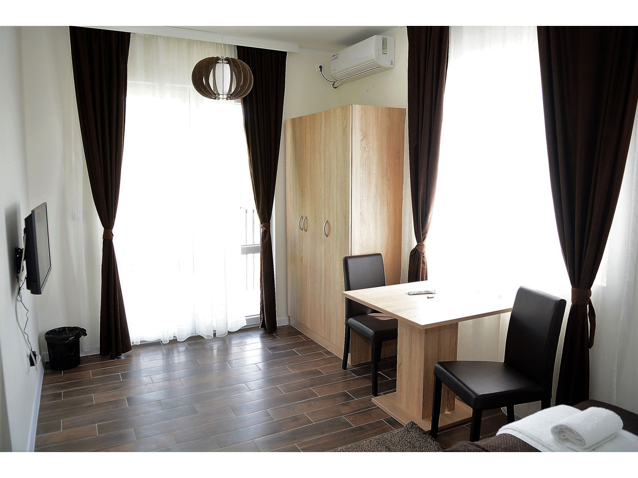 The rooms all have high-quality modern furniture, air-conditioning and cable TV. Free parking with video surveillance is available to all hotel guests. Reception is open non-stop and our kind and professional sky will be happy to help you. Breakfast in the form of a buffet is included in your overnight stay price.