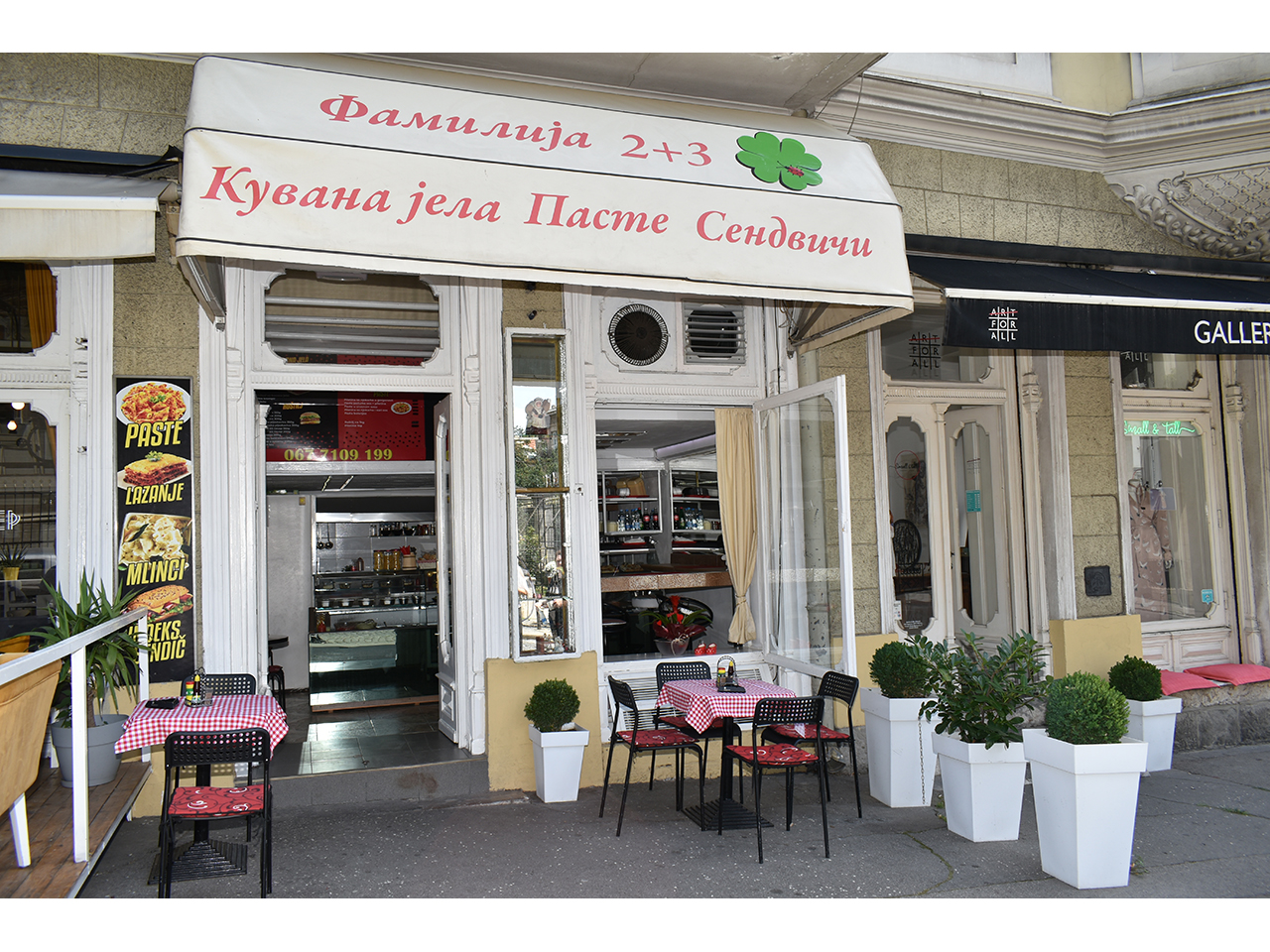 Ugostiteljski objekat Familija 2+3 se nalazi u ulici Kralja Petra 4a kod Saborne crkve i najstarije kafane "Znak pitanja".