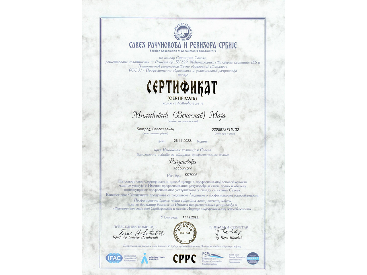 Naša licenca je izdata od strane Saveza računovođa Srbije, i Duo M Plus je od 2022 članica međunarodne organizacije IFAC.