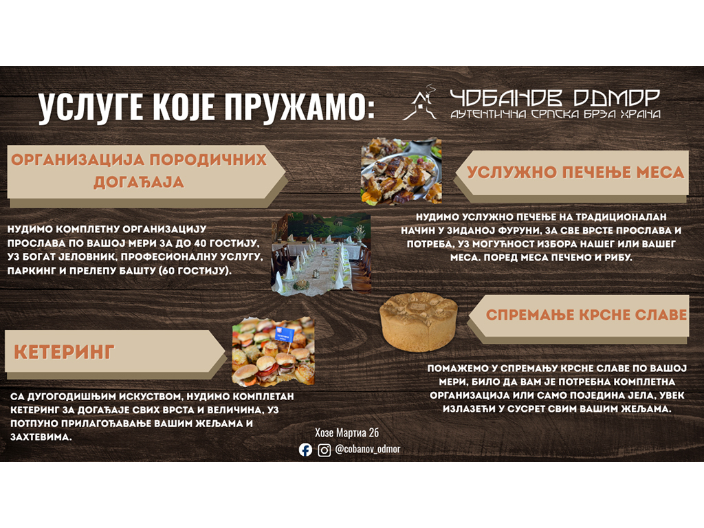 „Čobanov odmor“ je prvi i jedini lanac autentične srpske brze hrane, nastao nakon dugogodišnjeg rada restorana domaće kuhinje „Đuričić“. Tokom godina izgradili smo prepoznatljiv brend koji oživljava tradiciju zapadne Srbije i ističe vrednost domaćih proizvoda.