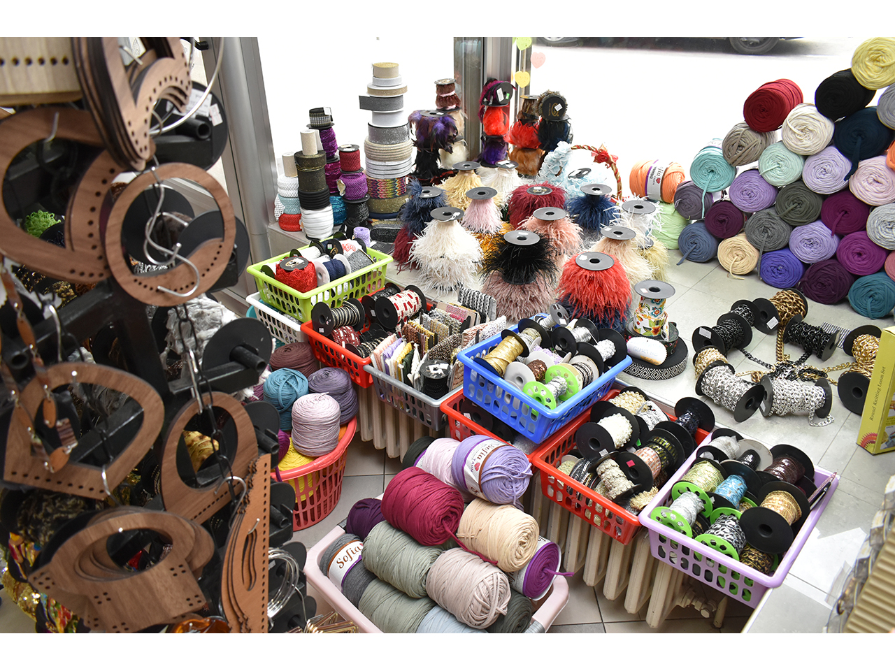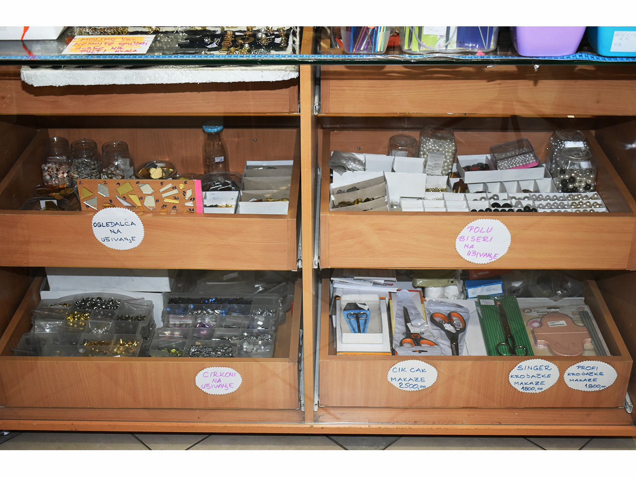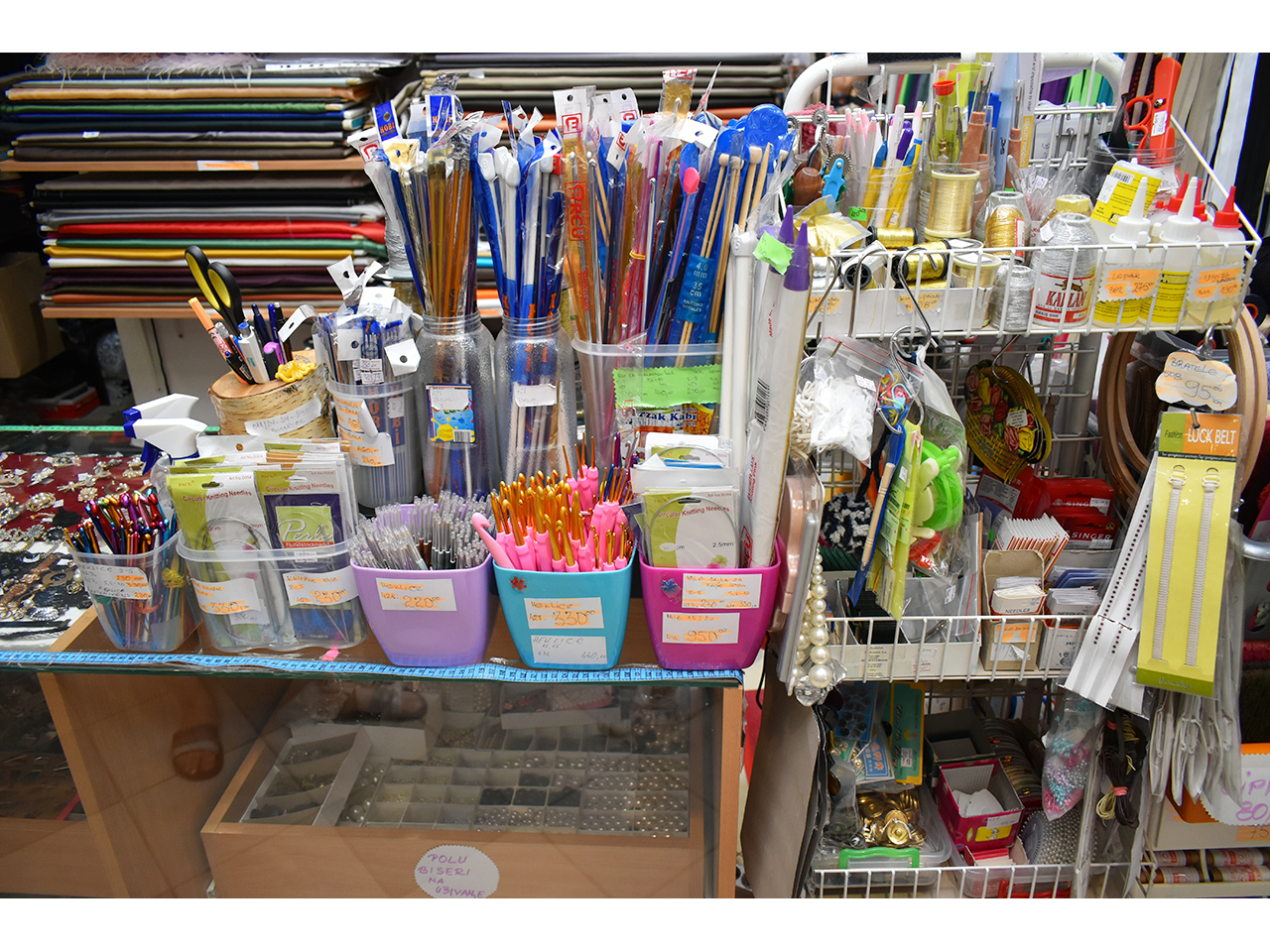 Čipka, vuna, kragne, igle, nitne, cirkoni, aplikacije, epolete, rips i saten trake, rese, konci, lastiš, broševi, kopče, krzna, rajsfešlusi, lepljivo platno, renderi, konci i igle za heklanje, modni lanci, perlice, učkuri, silikonske korpe za korsete, perje, šanel trake, cirkon trake za maturske haljine i venčanice, fišbajn i još mnogo toga po povoljnim cenama.
