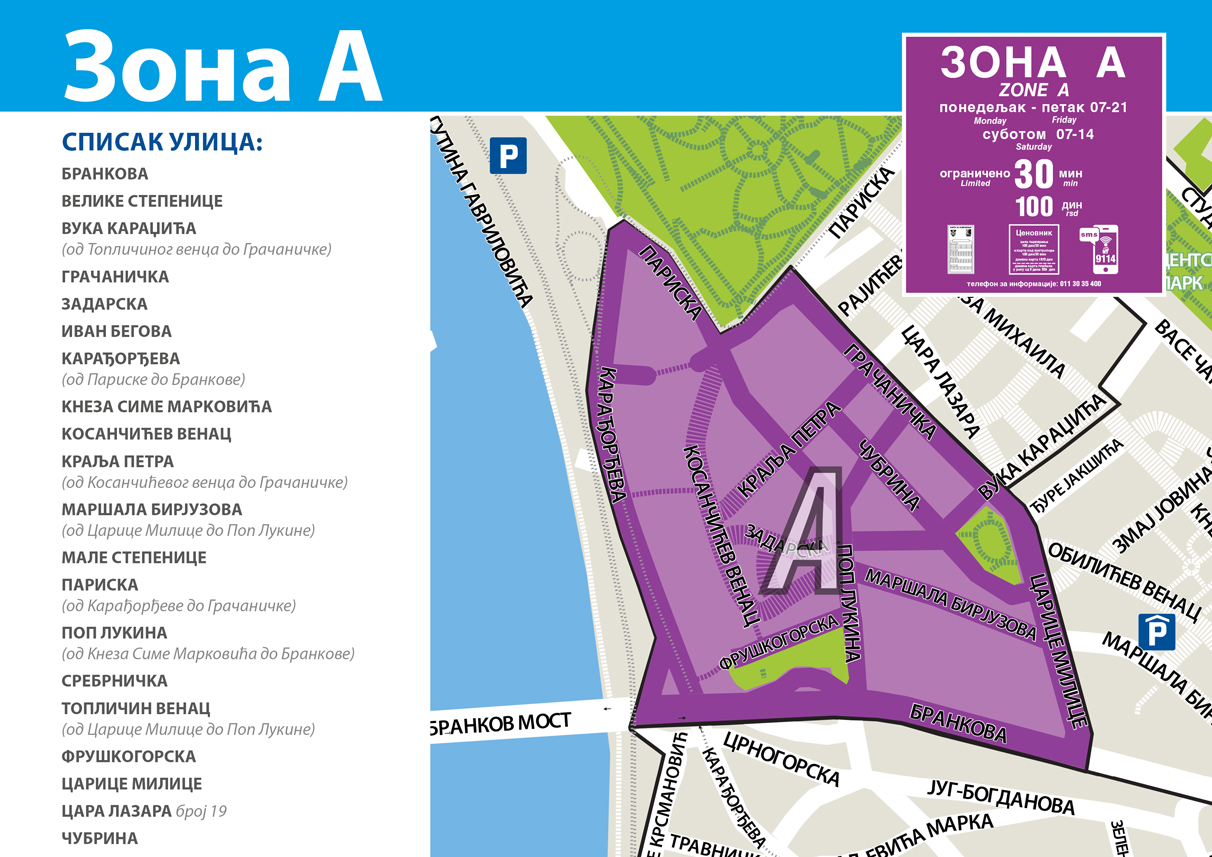 Nova Zona A, koja će biti označena ljubičastom bojom, obuhvata ulice oko Kosančićevog venca i to: Brankova, Carice Milice, deo Cara Lazara, Vuka Karadžića (od Topličinog venca do Gračaničke), Gračanička, Pariska (od Gračaničke do Karađorđeve), Karađorđeva (od Pariske do Brankove), Kneza Sime Markovića, Velike stepenice, Male stepenice, Fruškogorska, Kosančićev venac, Zadarska, Maršala Birjuzova (od Carice Milice do Pop Lukine), Topličin venac (od Carice Milice do Pop Lukine), Pop Lukina (od Kneza Sime Markovića do Brankove), Srebrnička, Kralja Petra Prvog (od Kosančićevog venca do Gračaničke), Ivan-begova i Čubrina