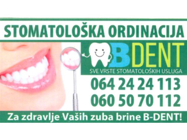 Stomatološka ordinacija Bdent nalazi se u ulici Kikindska br.2a u Borči, na uglu sa Zrenjaninskim putem, 30m udaljena od novoizgrađenog tržnog centra "SHOPI". Do ordinacije možete stići autobuskim linijama br. 96, 101, 85