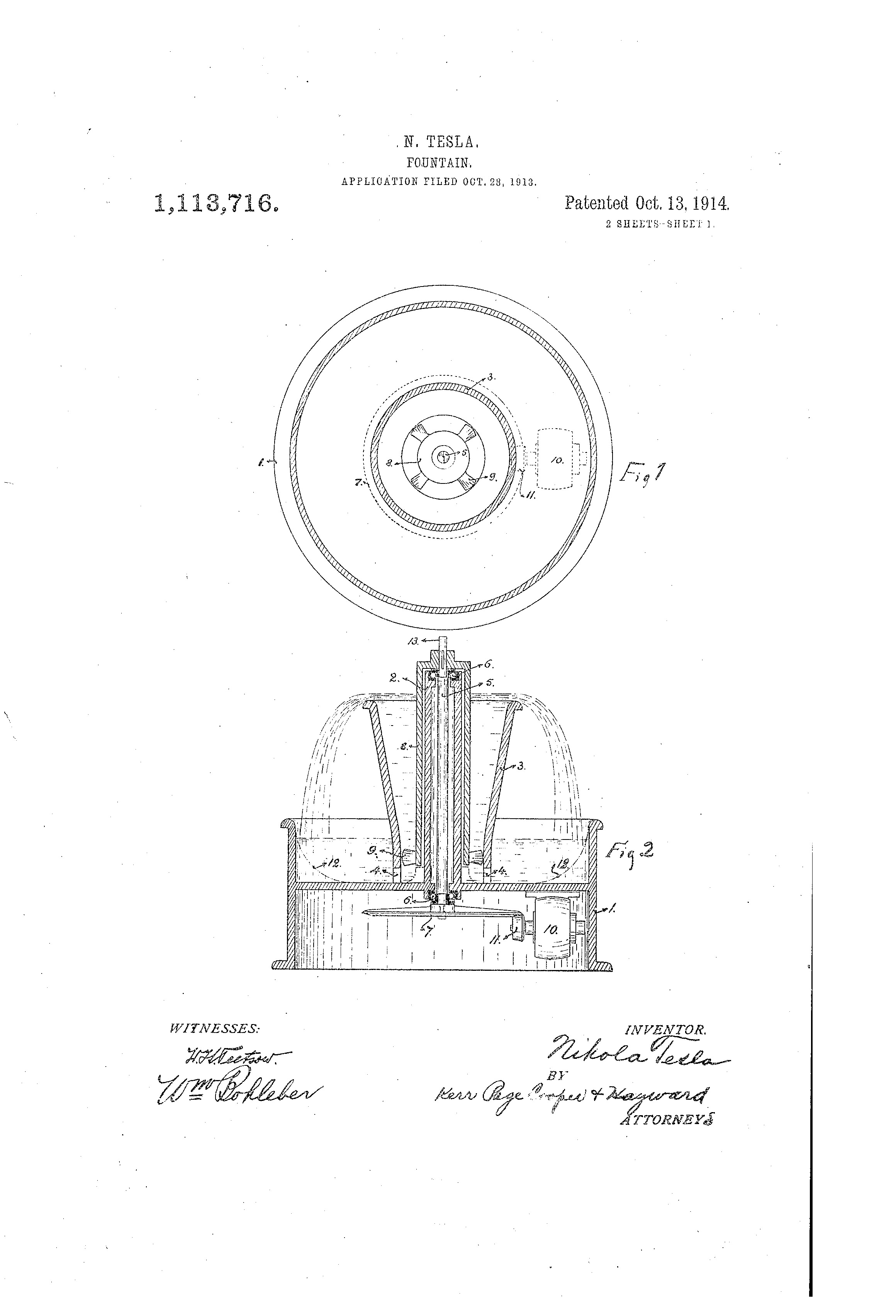 Voda je trebalo da cirkuliše velikom brzinom što bi omogućilo da se smanji njena potrebna količina, a da postignut efekat bude ogroman. U prijavi koju je 28.10.1913. godine predao američkom zavodu za patente, Tesla je napisao: "Neka se zna da sam ja, Nikola Tesla, građanin Sjedinjenih Američkih Država, sa prebivalištem u državi Njujork, pronašao određena nova i korisna poboljšalja fontana. U nastavku se nalazi celokupan, jasan i precizan opis."