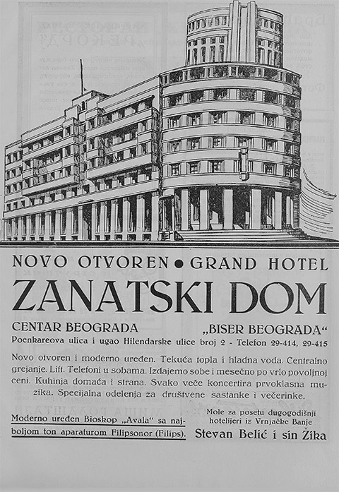 Novo otvoren i moderno uređen. Tekuća topla i hladna voda. Centralno grejanje. Lift. Telefoni u sobama. Izdajemo sobe i mesečno po vrlo povoljnoj ceni. Kuhinja domaća i strana. Svako veče koncertira prvoklasna muzika. Specijalna odelenja za društvene sastanke i večerinke.
