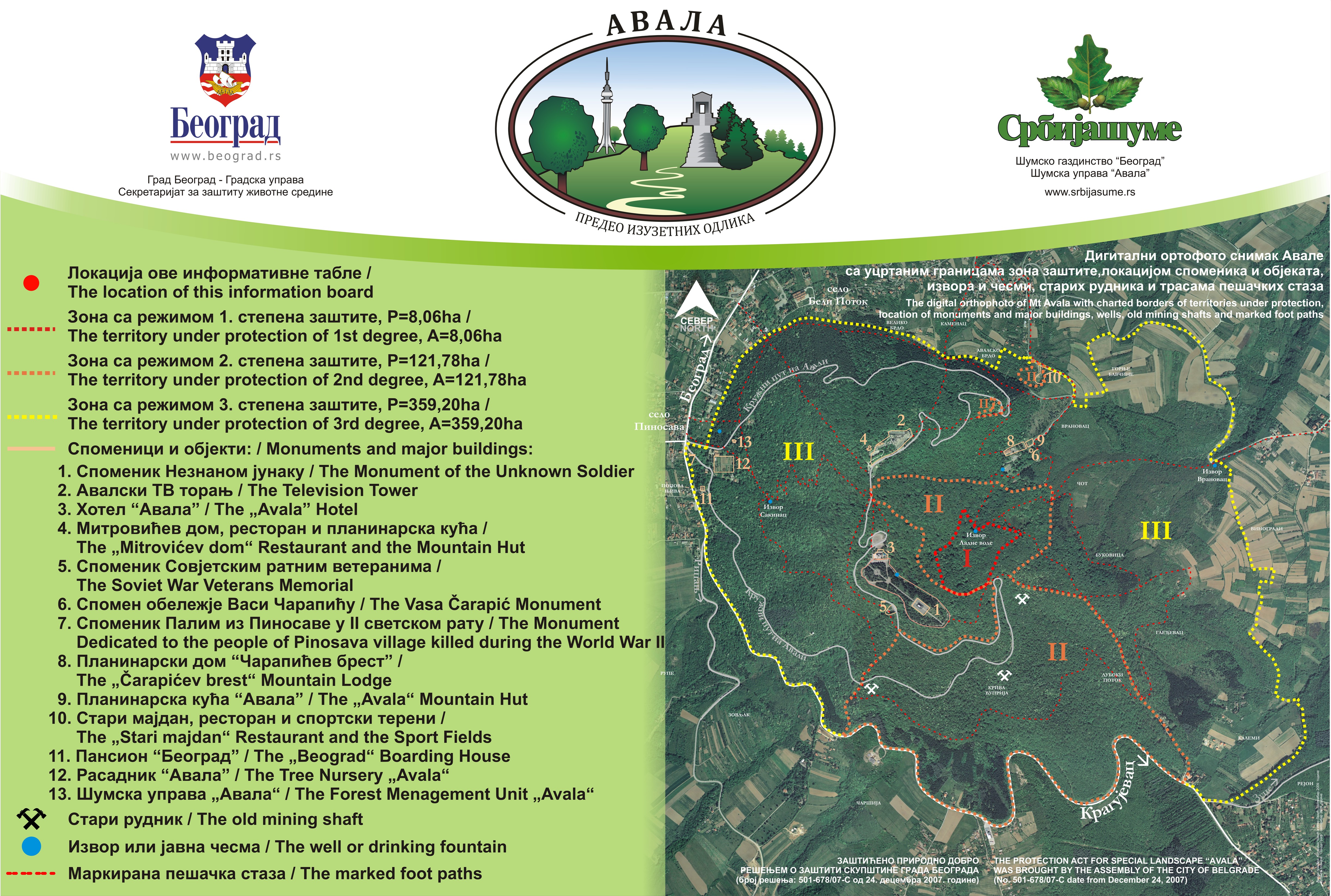 Staza vodi pored Avalskog potoka, te izvora Savinac, jednog od brojnih avalskih izvora, čija je voda nekada služila za proizvodnju piva u Vajfertovim pivarama. Danas nažalost više nije za piće. Atraktivna je i staza koja vodi od vrha Avale do Planinarskog doma Čarapićev brest, na kojoj možete da posetite izvor Ladne vode. Ovaj dom dobio je ime po mestu na kome se nekada nalazilo šest brestova ispod kojih je tadašnji avalski knez Vasa Čarapić pozivao okupljeni narod na ustanak protiv Turaka.